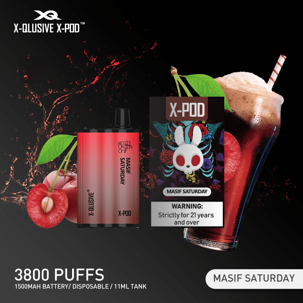 X-QLUSIVE X-POD MASIF SATURDAY Disposable vape is designed as a disposable device for leisure vaping, made of light SS material & providing comfortable hand feeling. Each device contains 11.0ml e-liquid, with a battery of 1500mAh to keep the device running up to 3800 puffs.